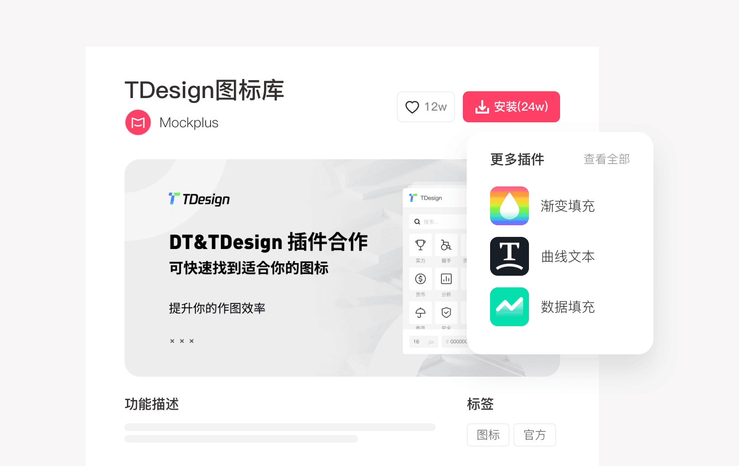 提供數據填充、圖標資源、快速復制等官方插件,可自由安裝使用,提升設計效率。