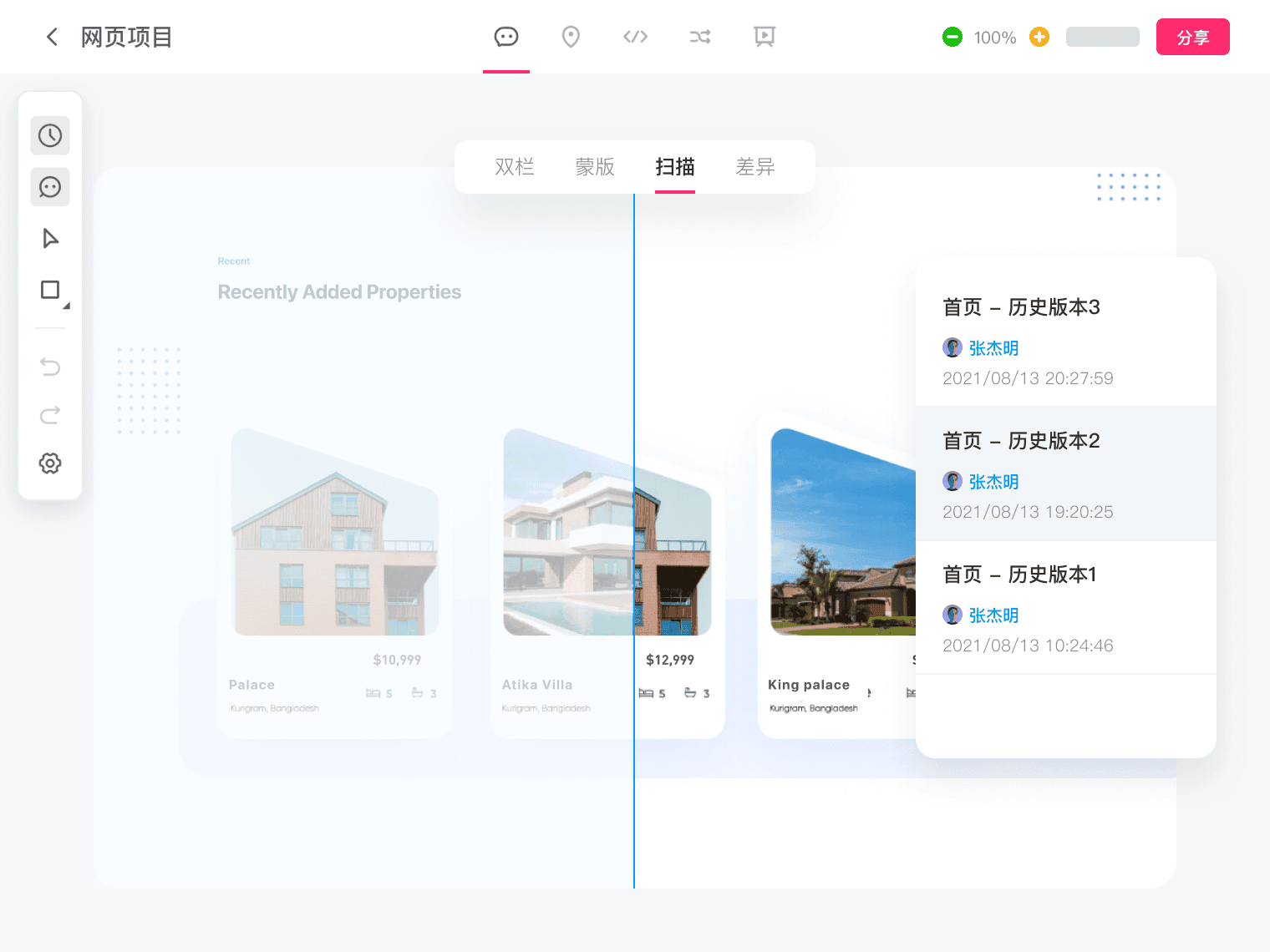 自動生成歷史版本,4種對比方式,任意比較兩個設(shè)計頁面和版本,版本差異一目了然,高效審核改進(jìn)。