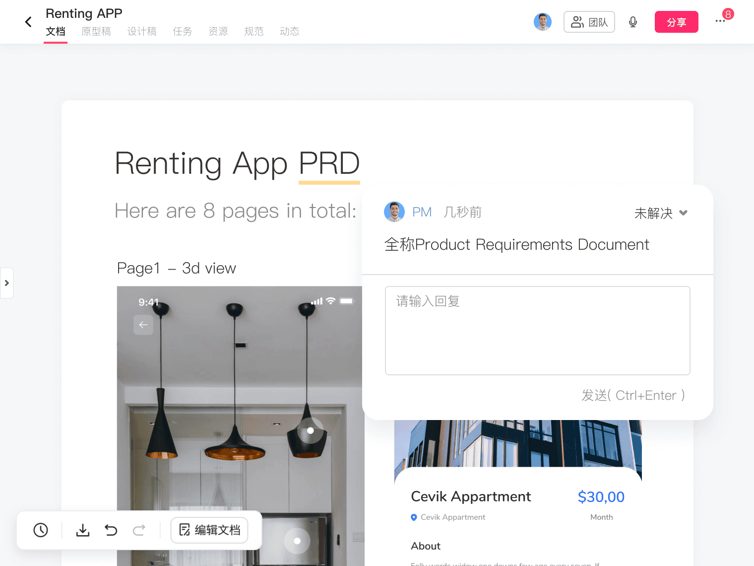 產(chǎn)品文檔在線撰寫,可插入設(shè)計稿/原型稿、打點(diǎn)評論等,團(tuán)隊(duì)查閱更方便。