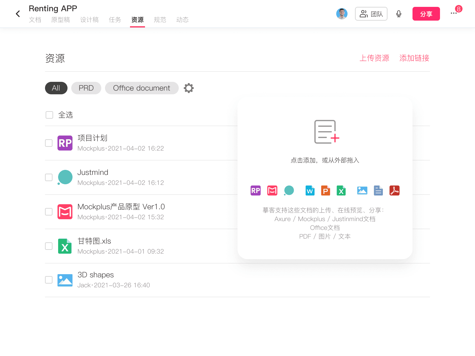 匯總和管理所有項(xiàng)目資源,如PRD、設(shè)計稿、文本、圖片、原型演示包等,方便團(tuán)隊(duì)共享和備份。