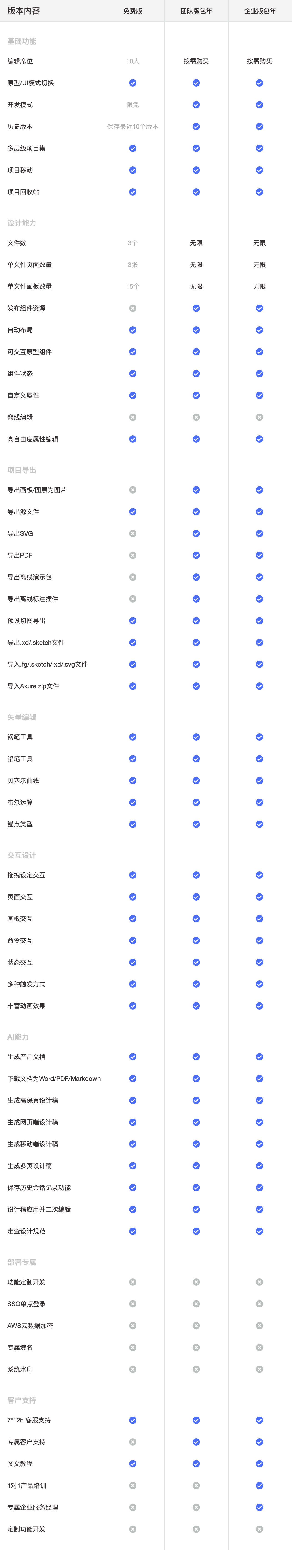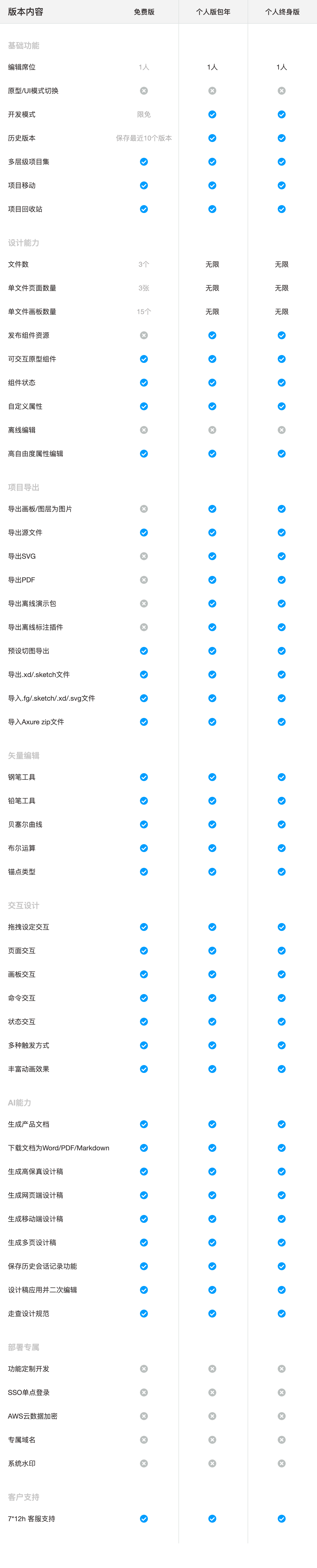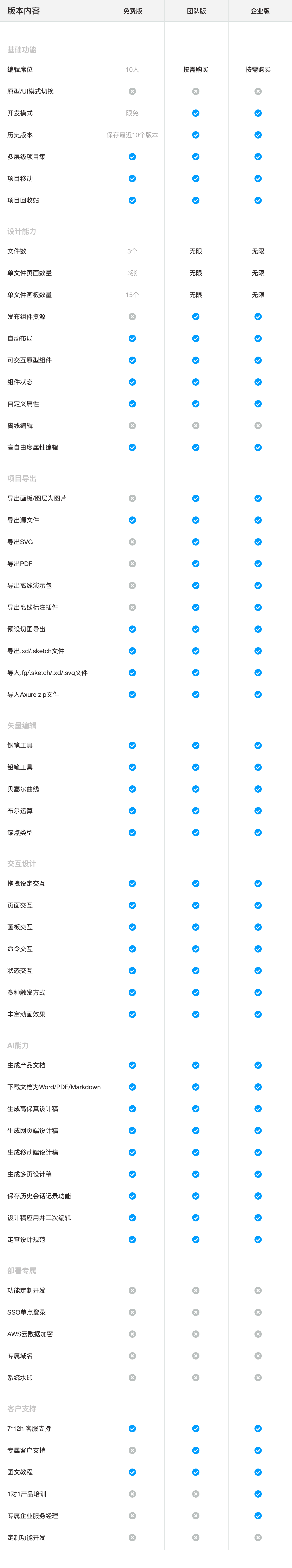 不同版本在功能上有區別,具體可在價格頁面查看功能對比。大家可以根據團隊人數和產品使用需求選擇購買CC或RP的創業版、企業版。如果對兩款產品都有使用需求,請購買摹客超級版。此外,如果公司對數據安全有特殊要求,可選擇企業部署版本,企業部署版本是將整個應用程序部署到企業內部自己的服務器,與線上版本相比,企業部署版更安全、高效及穩定。