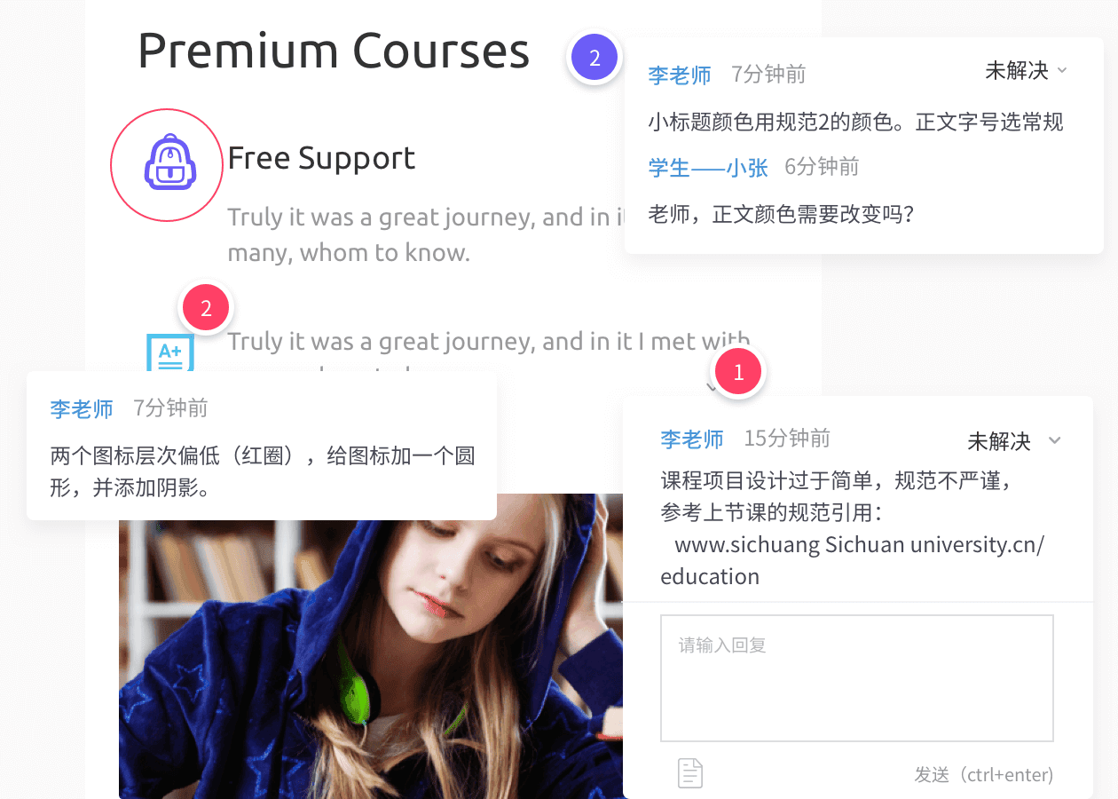 結合摹客平臺高效協作、快速演示等特點,將傳統課堂與摹客平臺相結合。學生通過摹客平臺分組完成實踐作業,提升學生的實踐動手能力、團隊合作能力和數字化思維。導師也可以借助摹客平臺強大的在線協作功能,在項目中添加評論,給予反饋,提升教學質量。